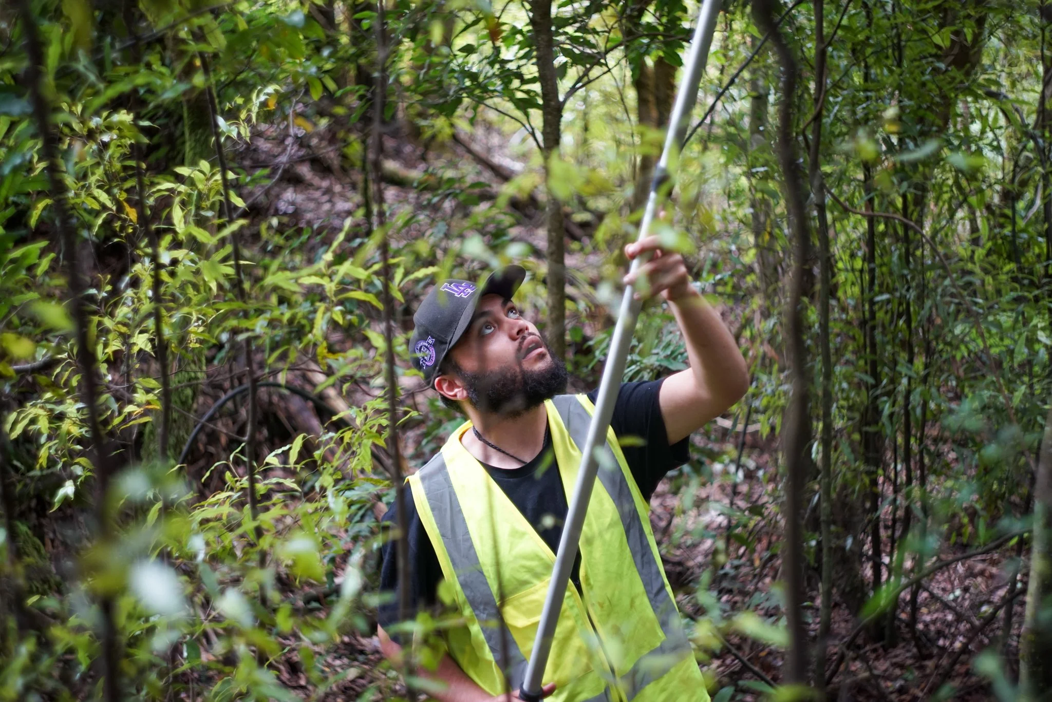 Izaiah Kiel installing an Acoustic Bat Monitor in Horohoro.